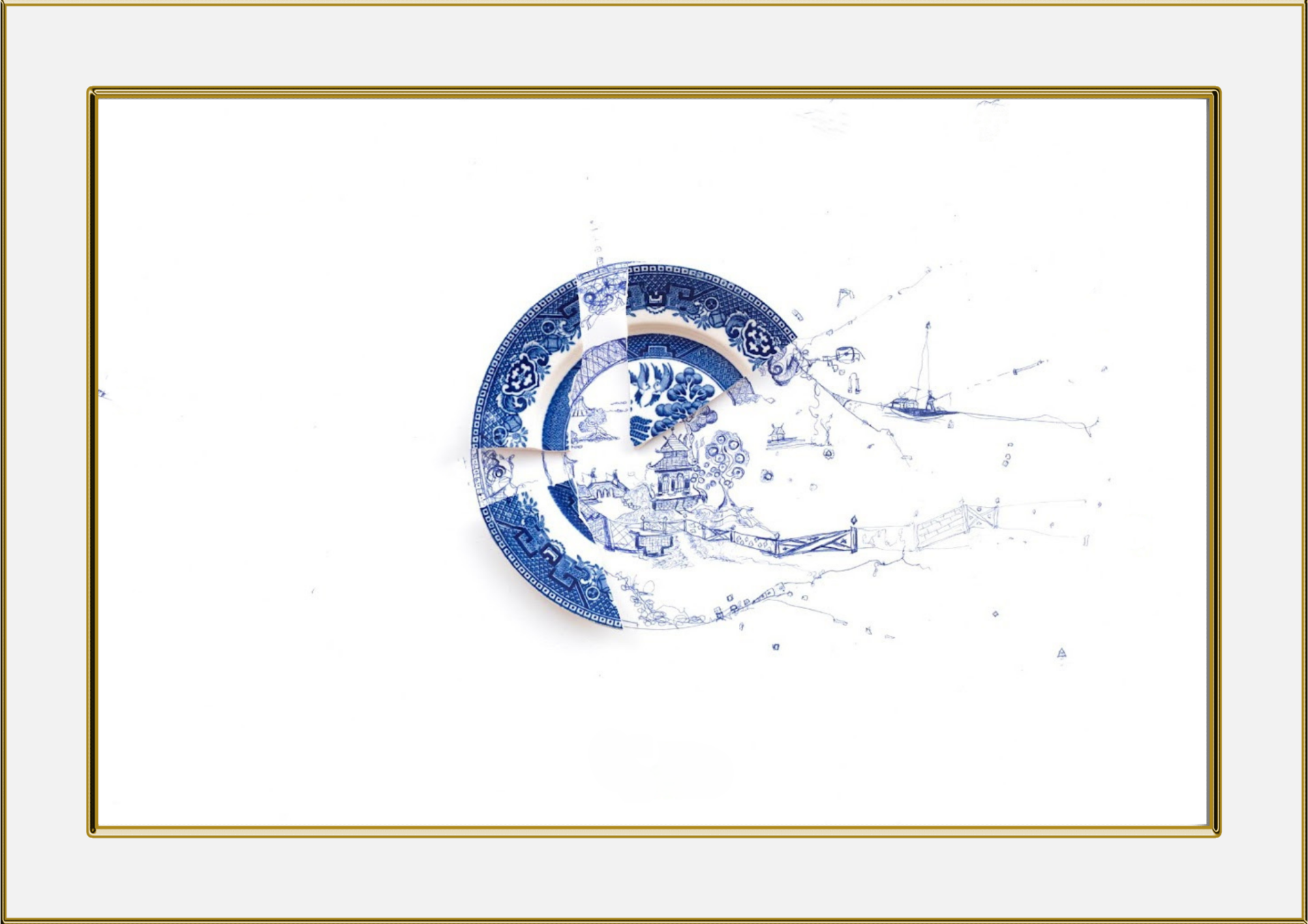 The current image perfectly blends hand-drawn illustration and physical object reconstruction. The delicate blue ink drawings extending beyond the plate's fractured edges evoke a narrative of incompleteness and beauty within imperfection — ideal inspiration for a limited-edition art series.