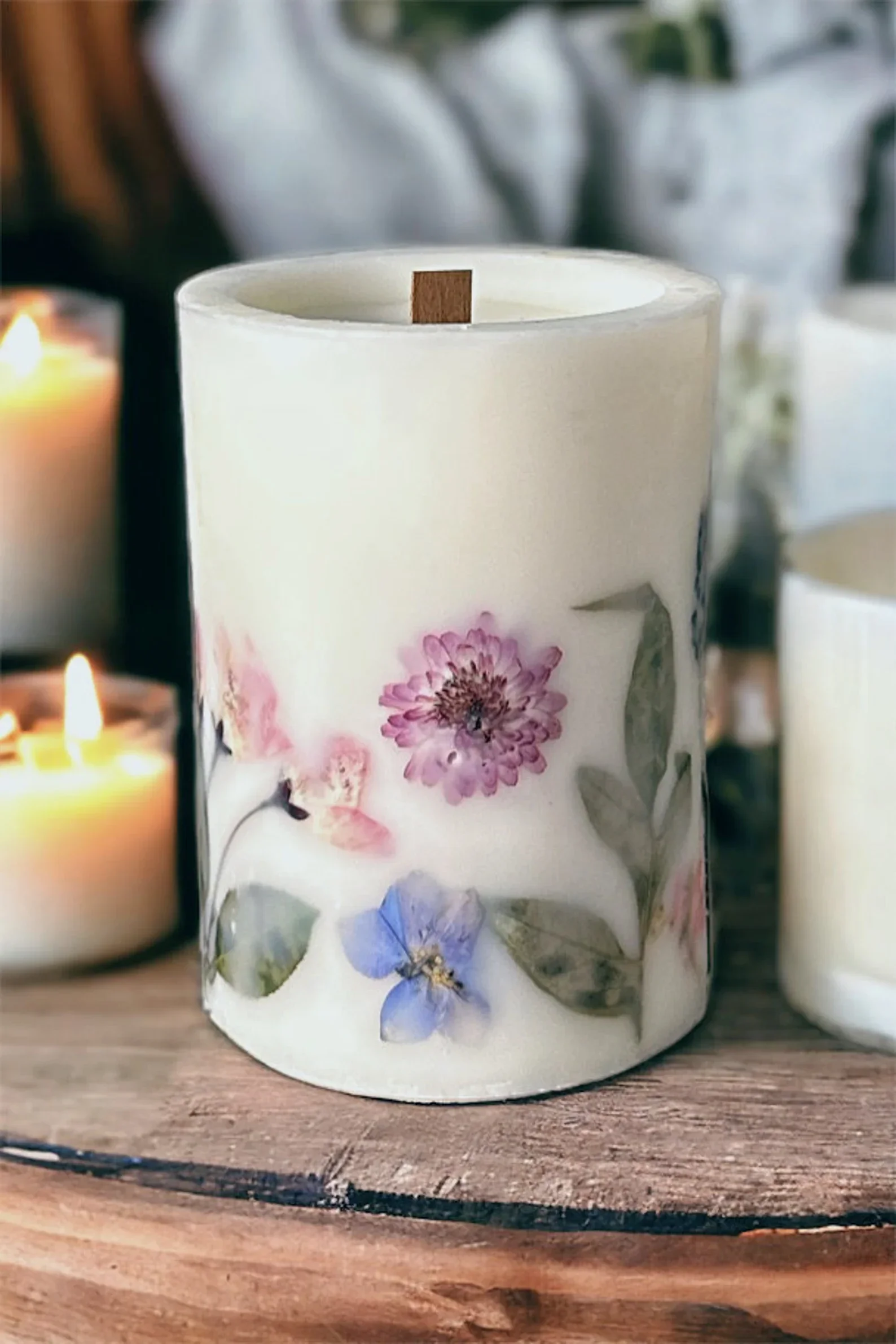 Real pressed dried flowers embedded in soy wax
