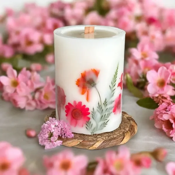 Pressed Flower Candle – Pink & Orange Floral Botanical Soy Wax Pillar | Handcrafted Candle with Wooden Wick for Gifts & Home Décor