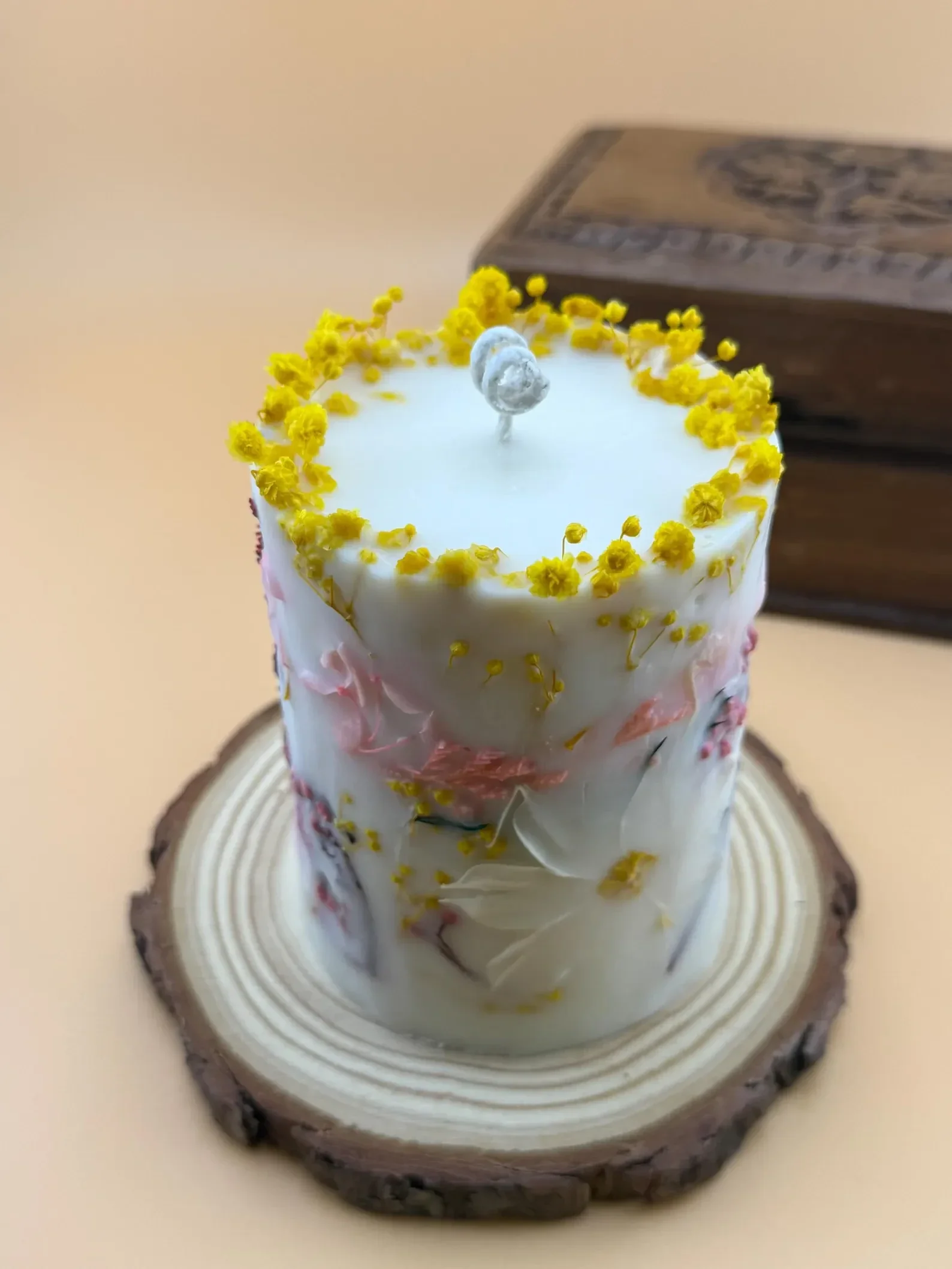 Dried Flower Botanical Candle – Yellow Bloom & Pink Petal Soy Wax Pillar | Handcrafted Floral Candle for Gifts & Home Styling
