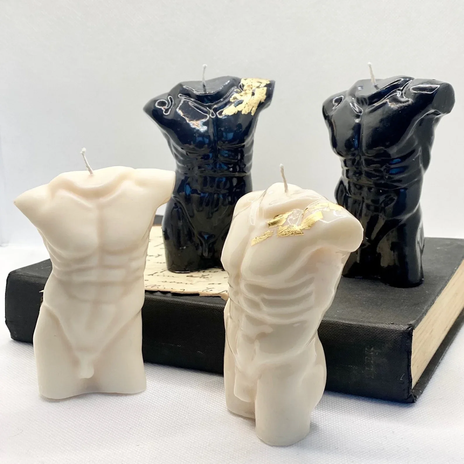 This handcrafted male torso candle embodies the raw elegance of classical sculpture with a contemporary twist. Featuring detailed anatomical lines and a touch of hand-applied gold leaf on the shoulder, it serves as a luxurious décor piece or a bold artistic gift. The smooth ivory wax and defined musculature evoke timeless masculinity and form.
