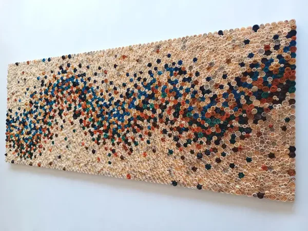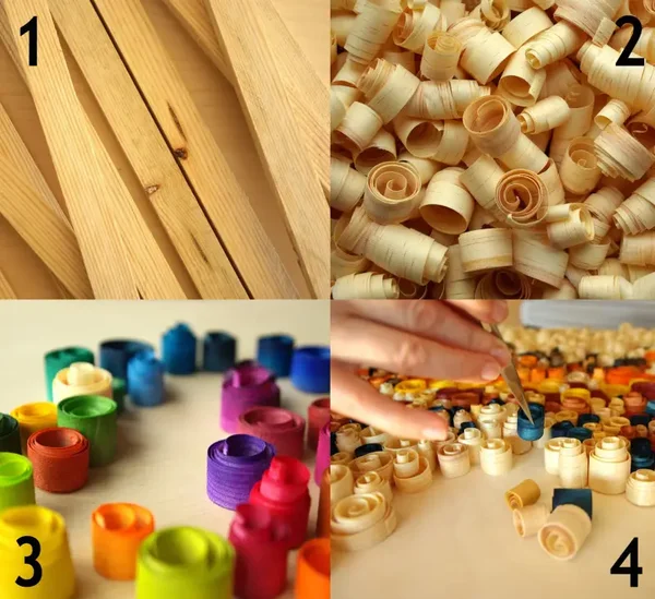 This elegant and organic wall sculpture begins with fine wood strips (Image 1), planed and curled into tight rolls (Image 2). Each roll is either left in its natural blonde tone or hand-dyed in rich, saturated hues (Image 3). Using fine tweezers and meticulous technique (Image 4), the artist arranges thousands of shavings into an intricate mosaic (final artwork shown in Image 5), evoking abstract pointillism and natural motion.
