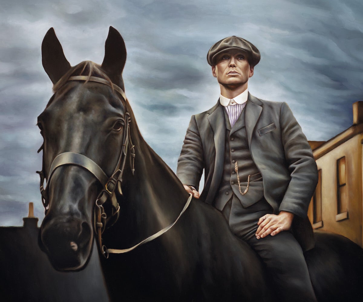 Adrian Hill’s meticulous attention to detail brings every element to life—from the polished leather bridle to the texture of the tailored wool suit. The dramatic contrast between the dark horse and the moody urban backdrop adds depth and cinematic intensity, making this piece an unforgettable homage to the BBC series’ dark allure.
