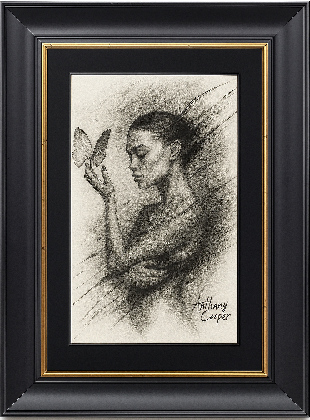 Whisper of Wings is a delicate pencil drawing that captures a moment of stillness and connection between a woman and a butterfly. Rendered with soft shading and flowing lines, the piece radiates grace and tranquility. The woman, partially turned in profile, gazes gently at the butterfly resting near her fingertips, as though sharing an unspoken understanding. Her posture—arms loosely folded across her chest—suggests vulnerability balanced by serenity. The textured background, with its sweeping strokes, gives the impression of movement in an otherwise quiet scene, enhancing the ethereal quality of the moment. The monochromatic palette adds timeless elegance, allowing the interplay of light and shadow to speak for itself. This artwork embodies themes of transformation, fragility, and the fleeting beauty of life, making it an evocative centrepiece for lovers of fine, contemplative art.