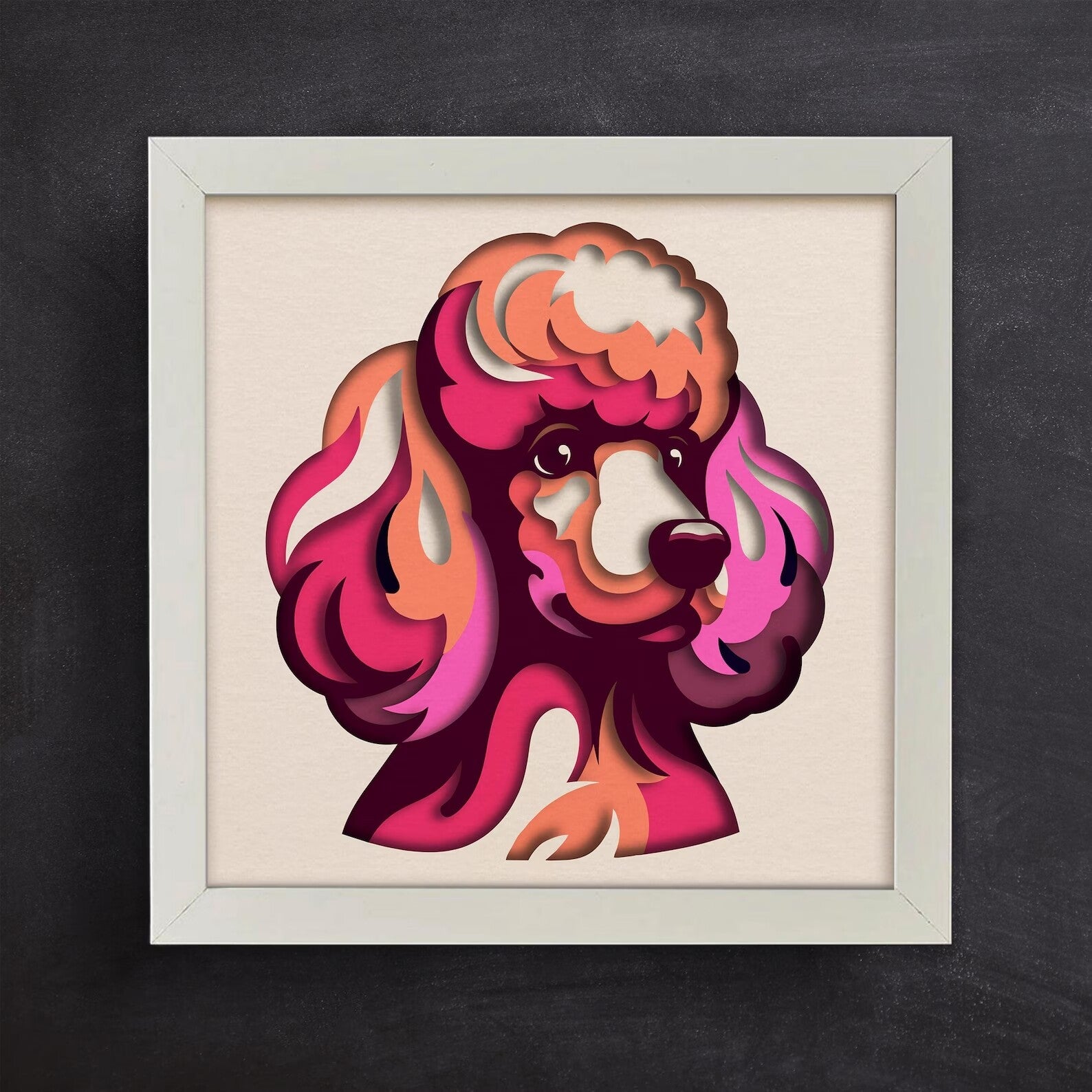 Vibrant Poodle is a stunning fusion of canine elegance and bold contemporary design. Featuring the refined profile of a poodle, this artwork explodes with vivid hues—magenta, golden yellow, teal, and deep navy—layered in a smooth, flowing cut-out style. The combination of rich colours and soft curves captures the breed’s signature charm and sophistication while giving it a modern artistic twist. Perfect for dog lovers, art collectors, and anyone seeking a statement piece, Vibrant Poodle adds instant character and warmth to any room. Its framed presentation and high-contrast palette make it ideal for living rooms, creative studios, pet boutiques, or as a thoughtful gift for poodle enthusiasts. This is more than just dog art—it’s a celebration of personality, poise, and vibrant style, making it a true standout in any home decor.