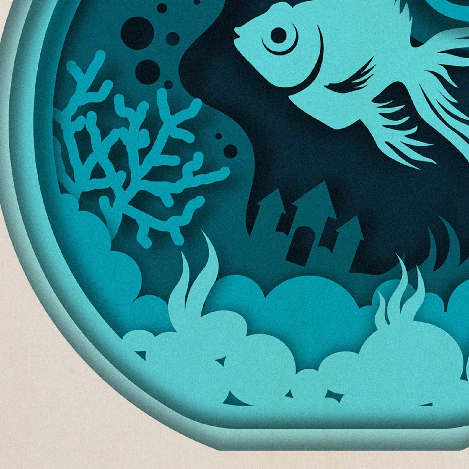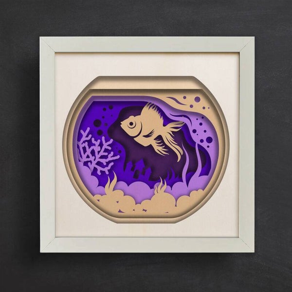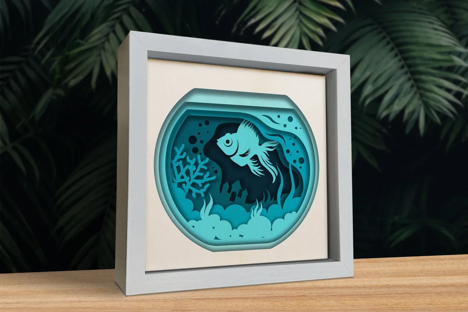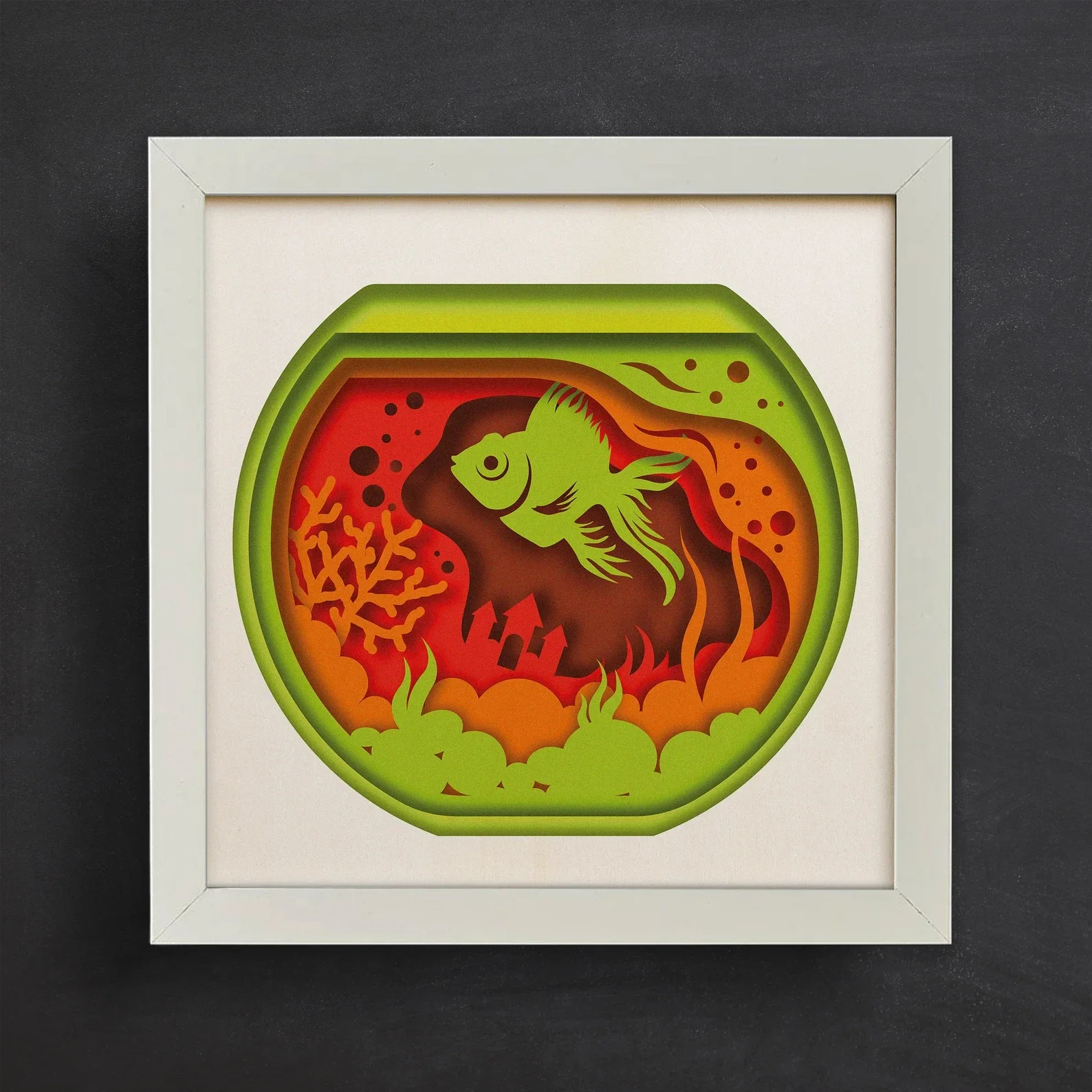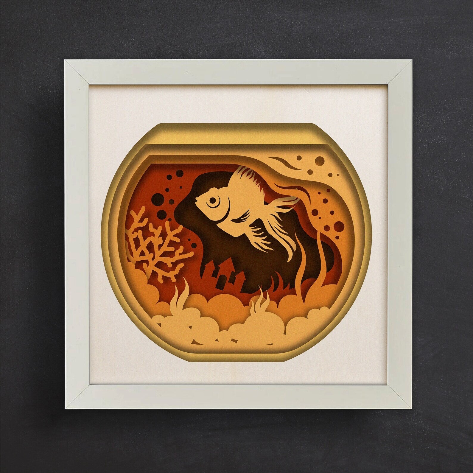 Golden Glow Fishbowl is a warm and captivating piece of layered art that brings the beauty of underwater life into your home. This design features a graceful fish swimming inside a round fishbowl, surrounded by coral, bubbles, and aquatic plants. Rendered in rich gradients of gold, amber, and deep brown, the layered cut-out style adds a sense of depth and movement, making the scene come alive. The harmonious colour palette creates a cozy and inviting atmosphere, perfect for living rooms, kitchens, or creative spaces. Ideal for aquatic life enthusiasts, this piece blends modern artistry with the timeless tranquillity of watching fish swim. Whether as a gift for a fish lover, an accent for coastal-themed décor, or a unique addition to a gallery wall, Golden Glow Fishbowl offers both style and serenity in one framed work of art.