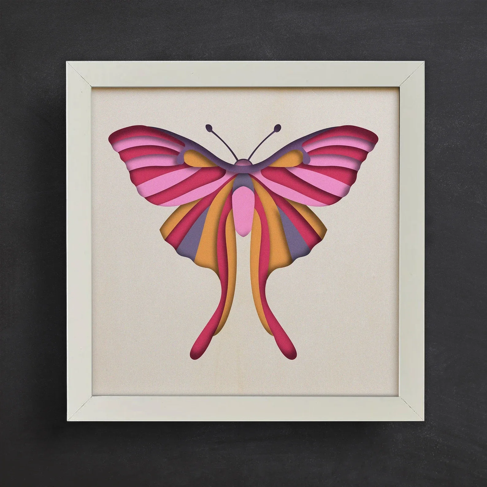 Pink Harmony is a beautifully balanced piece of layered art that radiates elegance and vibrancy. This design showcases a symmetrical butterfly with gracefully shaped wings in shades of deep magenta, bright pink, warm gold, and soft lavender. The layered cut-out technique creates depth and texture, giving the butterfly a refined three-dimensional look while maintaining a sleek, modern aesthetic. Its colour palette is both bold and harmonious, making it an eye-catching yet sophisticated addition to any room. Perfect for bedrooms, living rooms, studios, or as a gift for nature lovers, Pink Harmony embodies beauty, transformation, and grace. Whether displayed alone as a striking centrepiece or paired with other colourful nature-themed artworks, this framed piece brings a touch of artistry and uplifting energy to any wall.