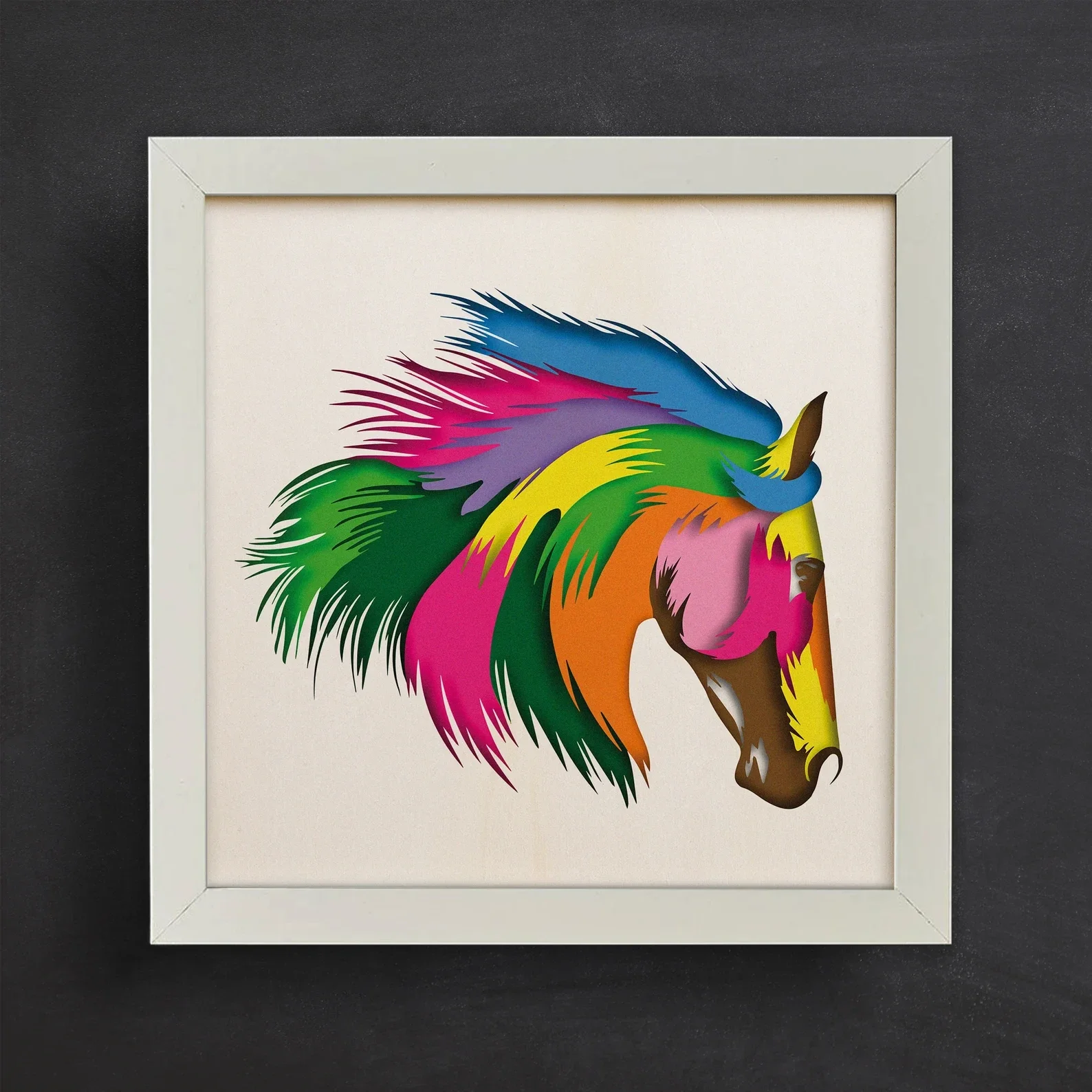 Rainbow Spirit is a stunning celebration of equine beauty and freedom, brought to life through an explosion of vivid color. This contemporary layered artwork features a majestic horse’s head with a flowing mane that bursts into shades of emerald green, deep magenta, sunshine yellow, fiery orange, ocean blue, and royal purple. The precision-cut layers create depth and texture, giving the mane a dynamic, wind-swept effect that radiates energy and motion. This piece perfectly balances the horse’s graceful form with a bold, modern palette, making it ideal for anyone who loves horses, vibrant décor, or statement art pieces. Whether displayed in a living room, office, or creative space, Rainbow Spirit adds both elegance and excitement to its surroundings. It’s more than just wall décor—it’s a colourful tribute to strength, speed, and freedom.