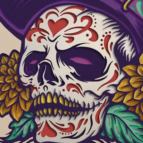 Sombrero Calavera is a striking celebration of Mexican culture and artistry, blending bold color with traditional symbolism. This artwork features a beautifully detailed sugar skull adorned with intricate red and white floral patterns, wearing a vibrant purple sombrero trimmed in turquoise accents. Golden marigolds frame the skull, symbolizing remembrance and honoring the departed, while green leaves add balance and vitality to the composition. Perfect for Día de los Muertos enthusiasts or admirers of Latin American folk art, this piece offers a modern twist on a time-honored tradition. The fine detailing and bold color palette make it an eye-catching addition to any living space, gallery wall, or festive décor setting. Whether as a seasonal decoration or year-round display, Sombrero Calavera exudes cultural richness, artistic passion, and a touch of rebellious charm.