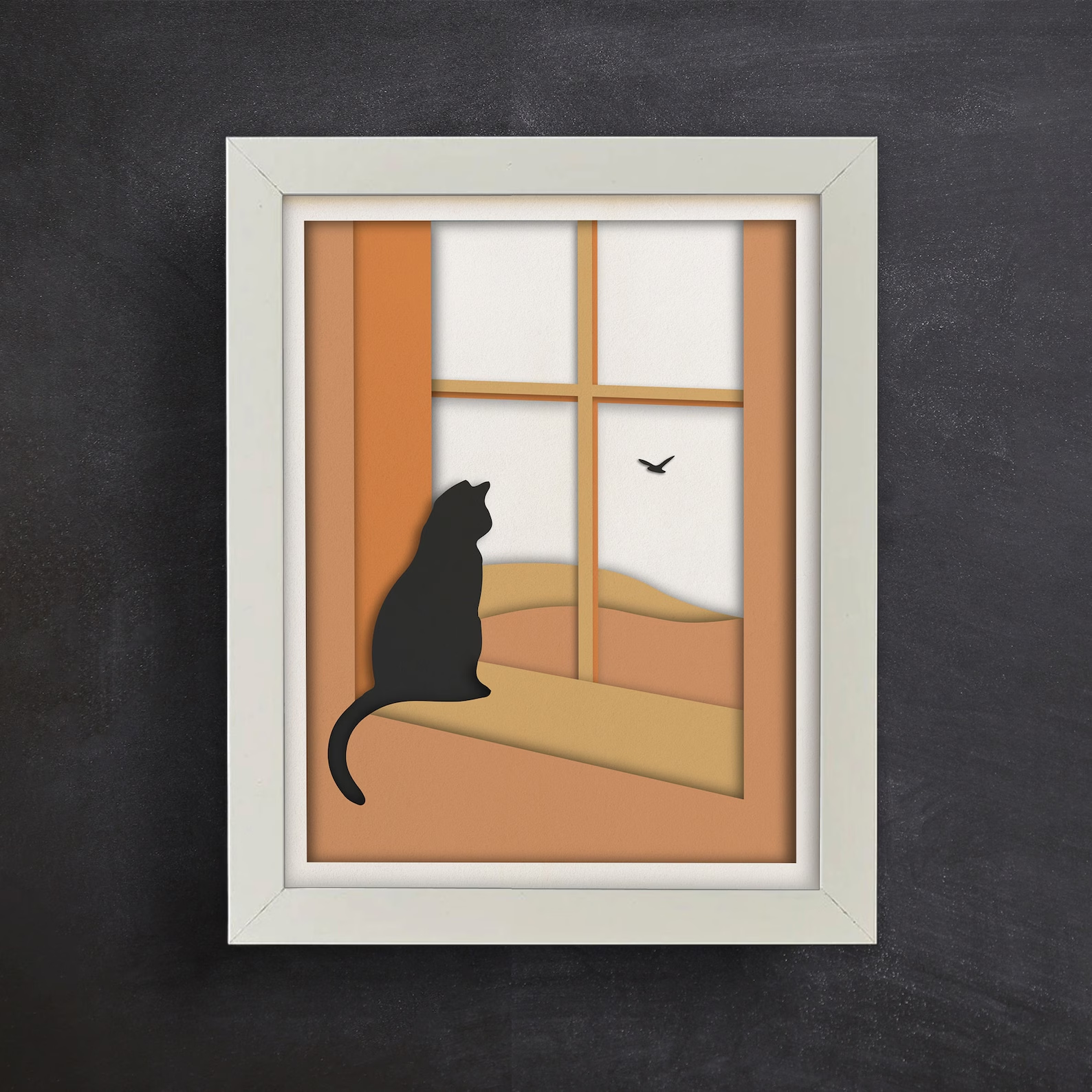 This elegant framed art piece captures a moment of serene curiosity — a silhouette of a cat gazing out of a window at a distant bird in flight. The design blends minimalism with layered paper-cut artistry, using calming shades of turquoise and white to create depth, warmth, and tranquility. The cat’s poised figure suggests both patience and longing, while the soft curves of the landscape outside the window evoke gentle waves or rolling hills. Perfect for cat lovers, nature enthusiasts, and admirers of modern wall décor, this artwork is versatile enough to complement any space — from a cozy living room to a contemporary office. Its clean lines and soothing palette bring a sense of peaceful contemplation, making it an ideal gift or personal keepsake. Whether you see it as a scene of quiet watchfulness or a symbolic reminder to look beyond the window, it is a timeless addition to your art collection.