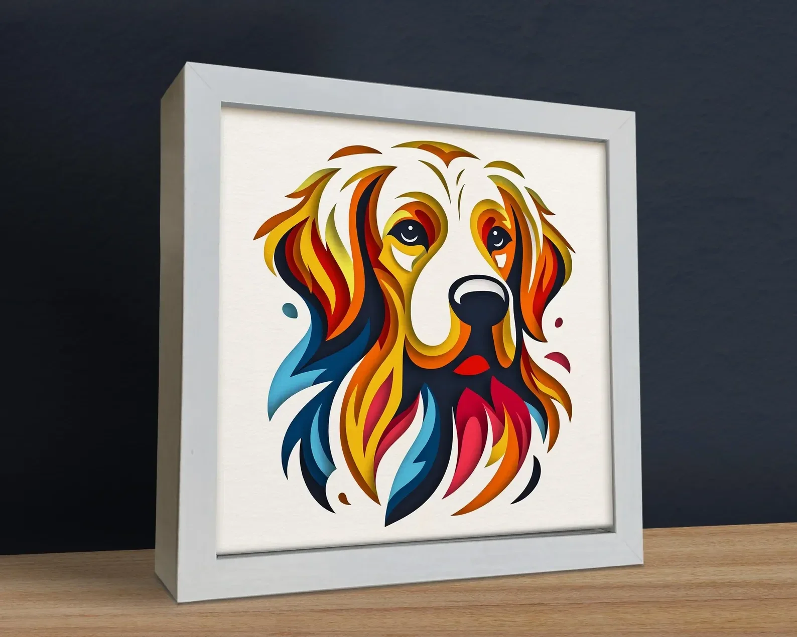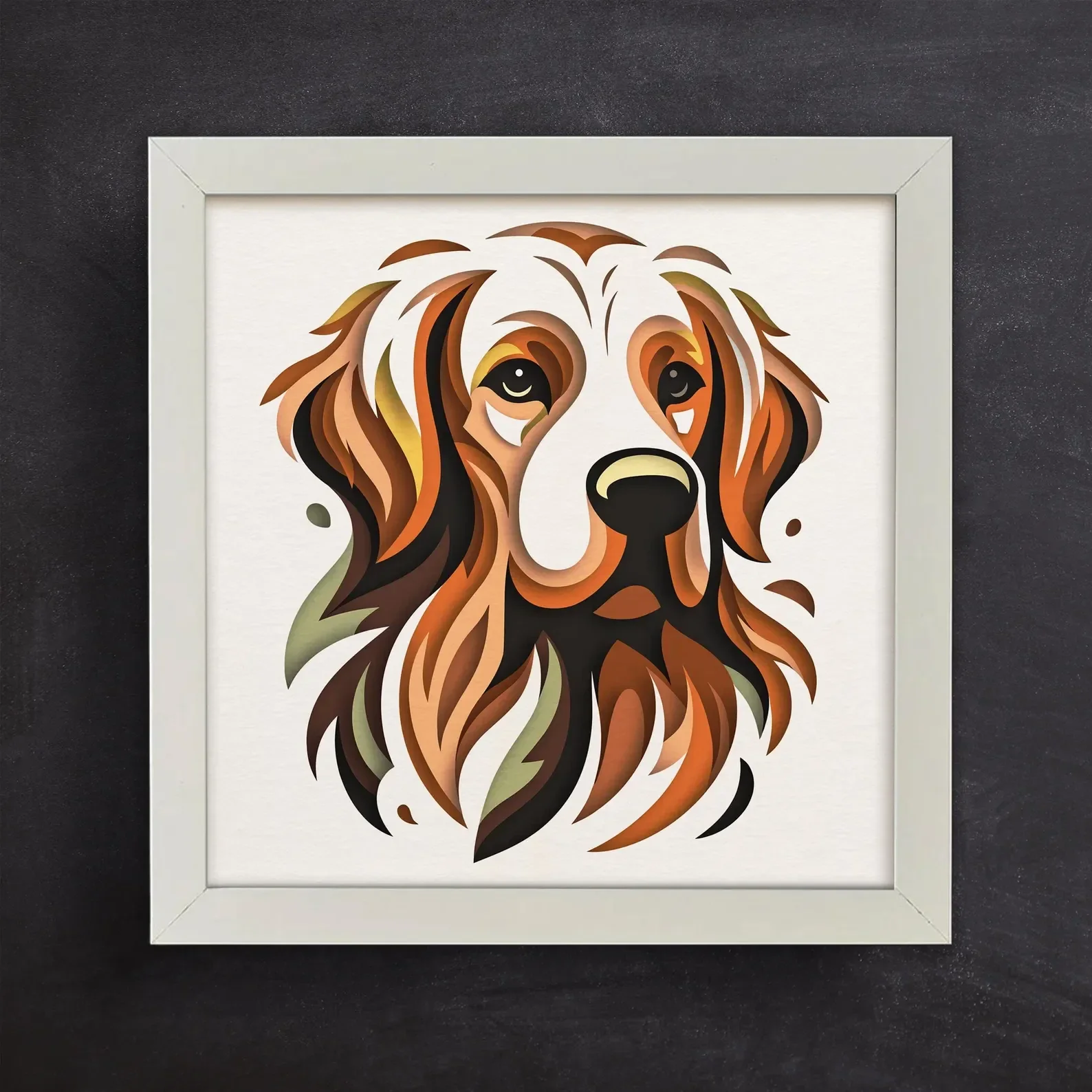 Celebrate the timeless loyalty and warmth of the Golden Retriever with this Golden Retriever Abstract Wall Art. Crafted in a sophisticated layered cut-out style, the portrait blends rich earth tones—gold, caramel, rust, olive, and black—to create depth, texture, and visual interest. The soulful eyes and gentle expression of the breed are captured with modern artistry, resulting in a piece that radiates comfort and companionship. Printed on premium materials and framed in a clean white border, it effortlessly complements both modern and classic interiors. Perfect for Golden Retriever owners, dog lovers, or anyone who appreciates elegant animal art, this piece works beautifully as a focal point in a living room, study, or hallway. Whether purchased as a personal treasure or a thoughtful gift, it brings the heartwarming spirit of man’s best friend into any home.