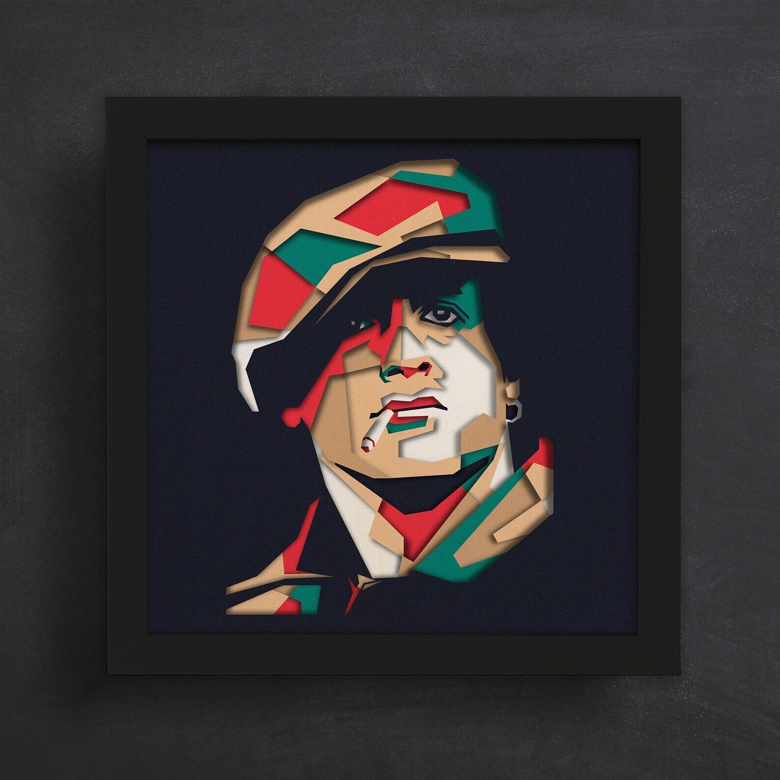 urban portrait wall art, layered paper portrait, bold pop art style, gangster art print, modern portrait wall hanging, dramatic face artwork, contemporary wall décor, street style wall art, iconic portrait artwork, layered paper wall décor, bold modern art frame, unique portrait gift, abstract face art, smoking portrait artwork, edgy wall hanging, pop art inspired décor, urban room artwork, cool wall art for men, statement wall piece, portrait framed print, colorful portrait décor, urban pop wall art, modern character art, dramatic wall art print, stylized portrait artwork Add striking personality to your walls with this Urban Portrait Wall Art. Featuring a layered paper design with bold geometric cuts and vivid color contrasts, this artwork portrays a confident figure in a cap with a cigarette, blending street style with modern artistic flair. The deep shadows and sharp color blocks of red, green, beige, and black bring a sense of drama and intensity, making it a statement piece in any room. Perfect for fans of bold contemporary design, urban culture, or expressive portrait art, this piece delivers a stylish edge to home décor. Its layered construction gives a three-dimensional effect, enhancing both texture and depth. Ideal for living rooms, studios, offices, or as a standout addition to a gallery wall, this artwork captures attention instantly. A thoughtful gift for art lovers and anyone with an appreciation for gritty yet modern aesthetics, it’s more than décor—it’s an attitude.
