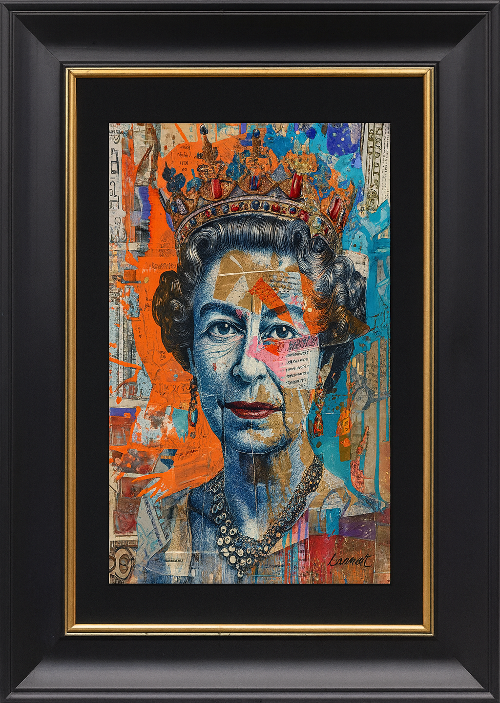 Limited edition royal art, Queen artwork, signed collectible art, royal portrait painting, abstract monarchy artwork, exclusive royal wall art, modern regal painting, contemporary queen portrait, collectible signed artwork, royal family inspired art, bold royal wall decor, rare queen painting, vibrant monarchy artwork, abstract royal collectible, queen fine art print, gallery style royal portrait, luxury wall art, iconic queen painting, artist signed royal art, investment art piece Crowned Legacy” is a limited edition, artist-signed royal-inspired masterpiece that merges abstract vibrancy with regal elegance. This bold artwork portrays the iconic image of a queen, brought to life with layered textures, vivid splashes of orange and blue, and a striking mixed-media style that fuses tradition with modernity. The regal crown, adorned with rich tones of gold, red, and sapphire, commands attention, symbolising power, history, and timeless legacy. Each edition carries the artist’s signature, making it a highly collectible and authenticated piece of contemporary art. Perfectly framed with a sleek black and gold trim, “Crowned Legacy” is designed to elevate any space into a gallery-worthy display. More than a portrait, it is a conversation piece that celebrates royalty through the lens of modern artistic expression. With limited availability, this signed edition is both a decorative treasure and an art investment destined to appreciate in cultural and aesthetic value.