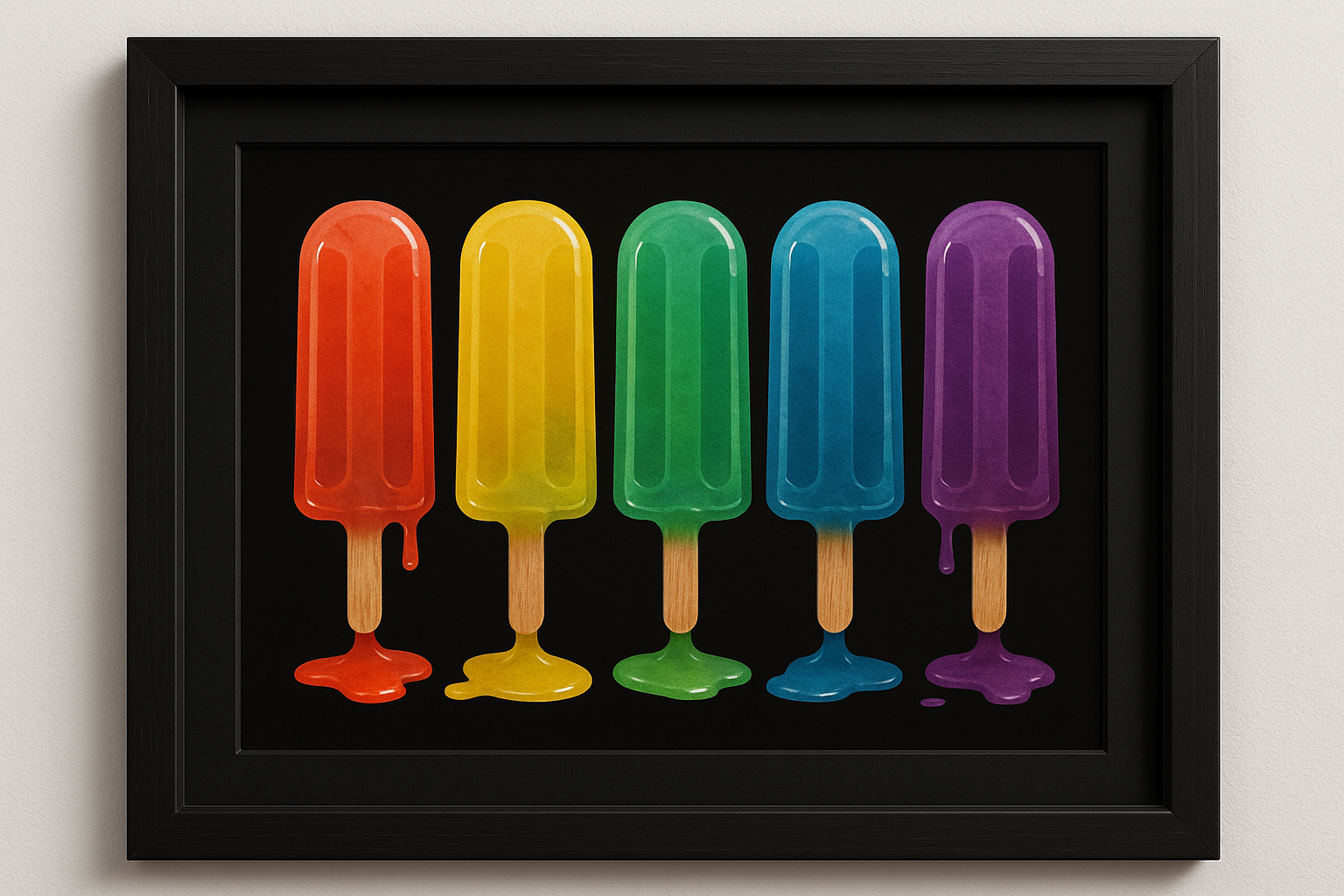 Add a splash of colour and playfulness to your walls with Melting Rainbow Popsicle Art. This striking artwork captures the joyful spirit of summer, featuring five vibrant popsicles in bold rainbow shades—red, yellow, green, blue, and purple—dripping with delicious detail. Set against a deep black background, the colours burst vividly, creating a dramatic contrast that makes this piece both modern and nostalgic. Perfect for kitchens, dining areas, cafes, or contemporary living spaces, it brings a playful energy while doubling as a conversation starter. The melting popsicles symbolize fleeting moments of joy, reminding us to savour life’s sweet pleasures. Printed with high-quality detail, this piece is ideal for art lovers, food enthusiasts, or anyone looking to brighten their home décor with a bold, fun, and stylish touch. Whether gifted or displayed, this artwork captures happiness, colour, and creativity in one refreshing design.