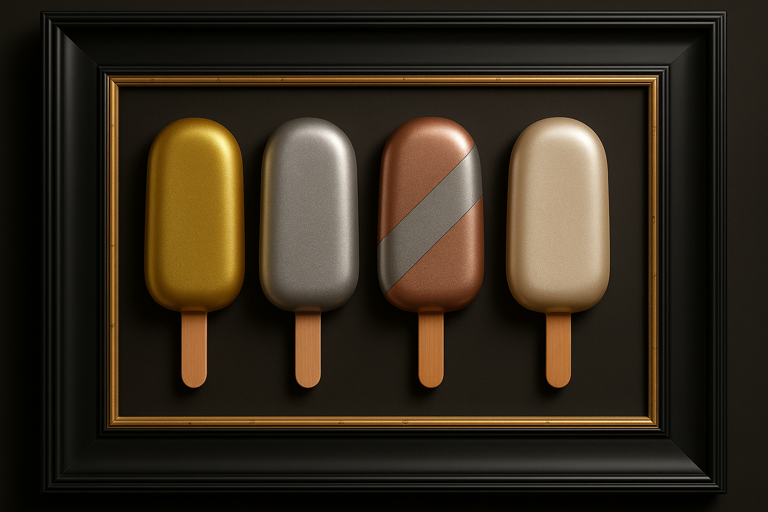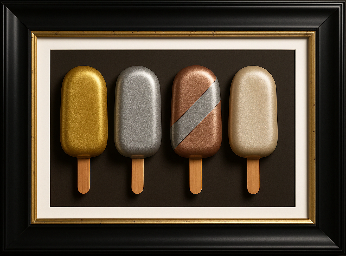 Sophistication meets playfulness in the Metallic Popsicle Elegance artwork. This striking piece showcases four resin popsicles, each designed with a sleek metallic finish—radiant gold, shimmering silver, warm bronze with a silver stripe, and soft champagne. Arranged neatly against a deep background and framed with black and gold accents, the composition transforms a nostalgic childhood treat into a refined art statement. The glossy metallic textures catch light beautifully, giving depth and a luxurious modern feel. Perfect for upscale kitchens, dining rooms, offices, or galleries, this artwork adds a unique blend of fun and high-end design. Its minimal yet bold aesthetic makes it versatile for both contemporary and eclectic interiors. More than a décor piece, it embodies the fusion of innocence and elegance, playful joy and sophisticated artistry. Ideal for collectors or as a standout gift, this artwork elevates the concept of food-inspired resin art into timeless modern luxury.
