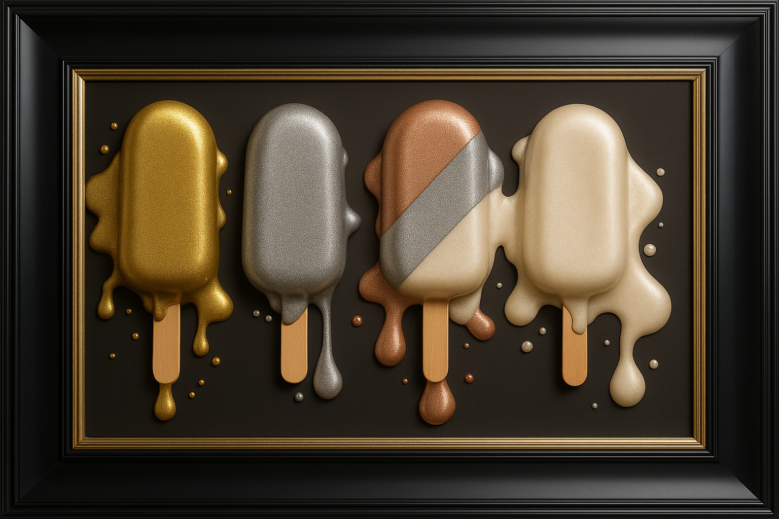 The Melting Metallic Popsicle Masterpiece takes playful nostalgia and elevates it into pure luxury. Featuring four resin popsicles in shimmering gold, silver, bronze-striped, and pearl champagne, this artwork captures the essence of indulgence with a melting, liquid-metal effect. Each popsicle drips elegantly downwards, creating movement and depth while maintaining a glossy, high-end finish. The metallic sheen reflects light beautifully, adding vibrancy and sophistication. Framed in sleek black with golden trim, the artwork commands attention as a bold centrepiece for upscale interiors, galleries, or boutique spaces. Perfect for those who appreciate both modern art and luxury décor, it transforms a familiar childhood treat into a refined statement of contemporary creativity. Ideal for collectors, design lovers, or as a showstopping gift, this piece blurs the line between whimsy and extravagance. A celebration of art, fun, and opulence—it’s the perfect addition to your premium collection.