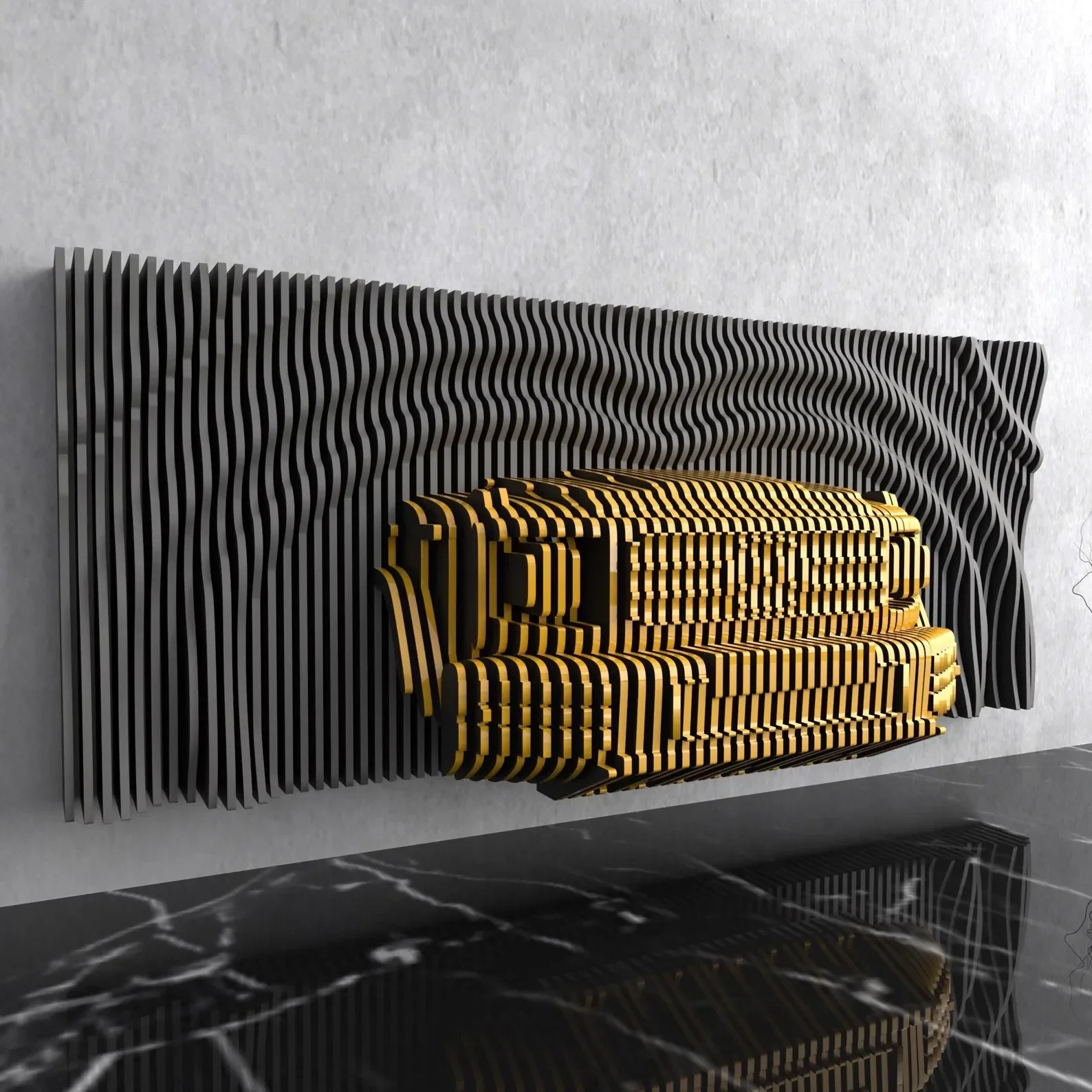 Urban Lines is a commanding statement piece from the Creativity Wall Arts Collection, fusing modern architecture with automotive form. This sculptural wall artwork features the striking silhouette of a rugged urban SUV emerging from a rippling field of layered contours. The precision-cut black and tan wave patterns create a fluid sense of motion, as if the vehicle is carving its path through the cityscape. Viewed from different angles, the design shifts visually—blending optical illusion, depth, and mechanical power. The natural wood tones contrast beautifully with the monochrome vehicle layers, creating a warm yet industrial aesthetic. Ideal for luxury offices, creative studios, automotive showrooms, or bold contemporary interiors, Urban Lines symbolises strength, progress, and innovation. This piece transforms any wall into a dynamic architectural feature, making it a perfect choice for collectors, designers, or enthusiasts seeking a powerful fusion of engineering elegance and modern design energy.Note: Each piece is individually crafted to order. Please allow 21 days for delivery to ensure optimal quality and perfection.
