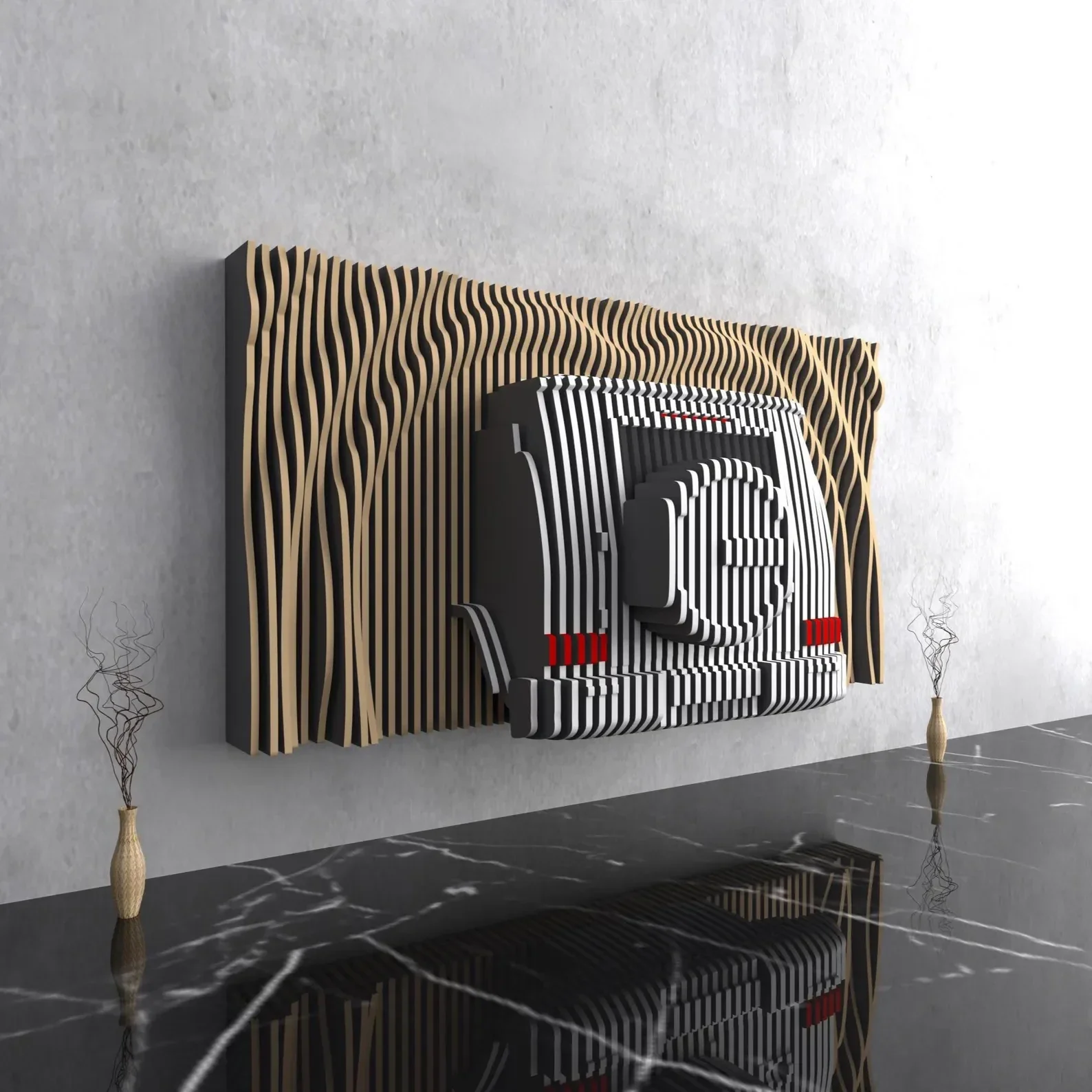 Introducing Waves of Precision, a striking 3D wall art piece where fluid red waves merge into the bold monochrome silhouette of an iconic off-road vehicle rear view. Crafted with meticulous layered contours, this artwork creates a powerful optical illusion — the vehicle seems to emerge from rippling waves, blending motion and mechanical precision. Each stripe and curve is hand-finished to enhance its sculptural depth, transforming any space into a gallery of innovation and style. This artwork isn’t just décor — it’s a conversation piece that celebrates design, engineering, and visual rhythm. Ideal for contemporary interiors, showrooms, studios, or collectors who appreciate architectural depth and geometric art.