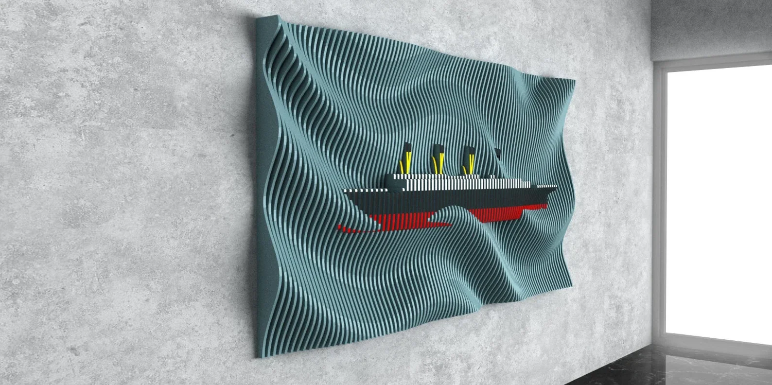Commemorate maritime history with Voyage Eternal, a captivating 3D wall sculpture that pays tribute to the legendary RMS Titanic. Crafted from flowing vertical layers of soft blue contours, this piece reveals a pixel-perfect silhouette of the iconic ocean liner, complete with its four yellow funnels and bold red hull. The sculptural waves create a sense of gentle motion, as if the Titanic is gliding across a living sea. This artwork fuses nostalgia, elegance, and engineering heritage, making it a striking focal point for maritime enthusiasts, collectors, offices, or gallery-style interiors. With its blend of subtle movement and crisp geometry, Voyage Eternal turns a wall into a portal to the golden age of ocean travel.