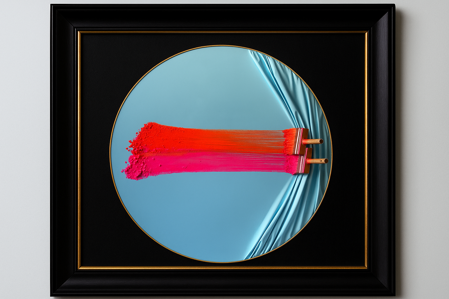 Chromatic Flow from the Creativity Wall Arts Collection is a celebration of fluid movement and vibrant energy, captured in an elegant circular composition. This striking framed piece features two brushes sweeping a radiant gradient of electric orange and hot pink across a silky blue backdrop, as if colour itself is being poured into motion. The satin-like folds echo ripples of water, enhancing the sensation of continuous flow. The round frame within a sleek black border with gold trim gives the work a refined gallery presence, balancing luxury with bold creativity. Perfect for high-end interiors, art studios, or innovative workspaces, Chromatic Flow symbolizes the birth of ideas, the fusion of opposites, and the courage to colour outside the lines. It is ideal for collectors, designers, and visionaries seeking a vibrant centrepiece that enlivens contemporary spaces with beauty, dynamism, and optimism.