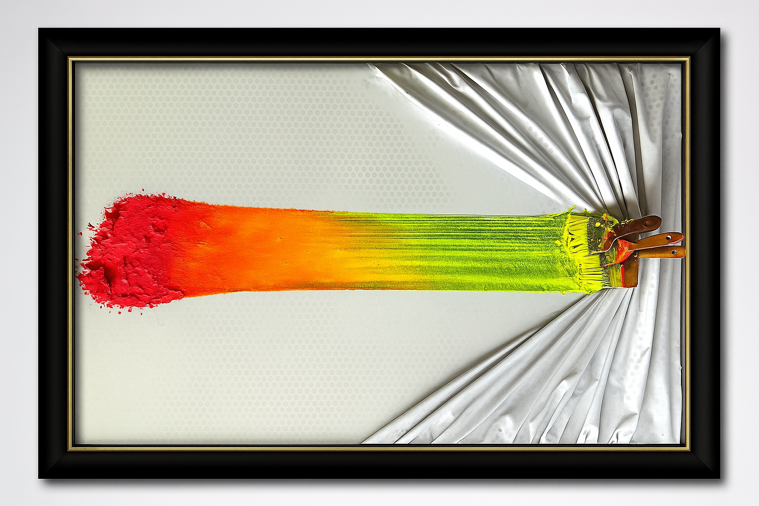 Thermal Bloom from the Creativity Wall Arts Collection radiates the visceral heat of creation itself. From a cluster of bound brushes emerges a searing stroke of colour, flowing from neon citrus green into molten orange and fiery crimson, as though paint were combusting into pure energy. The brush heads burst through draped silver fabric, breaking the passive surface and pushing into the viewer’s space with unapologetic force. Encased in a black frame edged with gold, the piece balances raw chaos with elegant control, transforming a moment of artistic eruption into a frozen arc of power. Thermal Bloom is both a celebration of chromatic intensity and a meditation on the thin line between discipline and abandon — ideal for modern interiors that crave energy, dynamism, and the vivid pulse of creative rebellion.