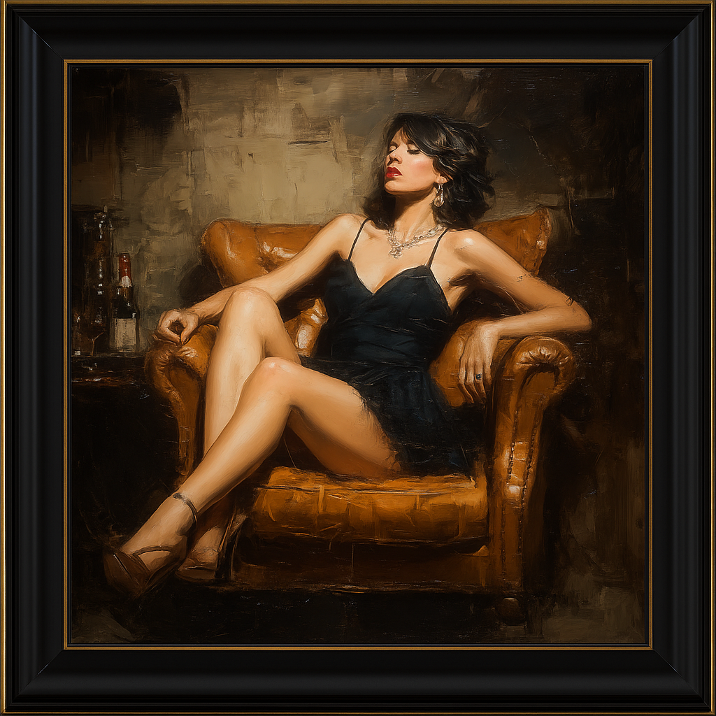 Velvet Elegance: Lady in Black is a striking portrait that radiates confidence, allure, and sophistication. Seated gracefully in a vintage leather armchair, the poised woman in a black evening dress commands attention with her powerful presence and timeless style. The painterly brushstrokes highlight the warmth of the setting, contrasting the deep tones of her dress with the rich amber hues of the chair. Her red lips, jewelry, and relaxed posture capture a mood of refined sensuality and effortless glamour. This piece is perfect for collectors of contemporary portraiture, adding drama and sophistication to any home, gallery, or luxury interior space.