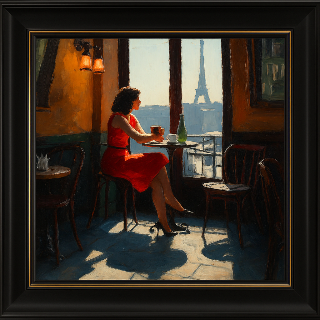 Café Moments in Paris captures the timeless romance of the French capital. A woman in a striking red dress sits gracefully by the window of a cozy Parisian café, her coffee in hand, as the Eiffel Tower rises elegantly in the background. The warm light spills into the room, contrasting with the cool shadows, creating a cinematic balance between intimacy and grandeur. This artwork evokes nostalgia, sophistication, and quiet contemplation, offering a glimpse into the charm of everyday Parisian life. Ideal for collectors and lovers of travel-inspired art, this framed piece brings a touch of Parisian allure into any space.