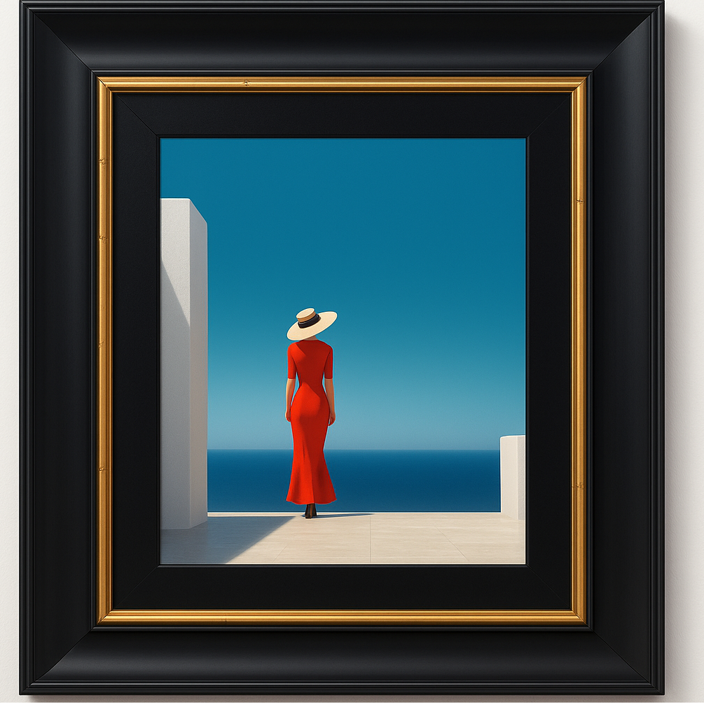 Silhouette by the Sea is a minimalist yet captivating artwork that radiates poise and serenity. A woman in a flowing red dress and wide-brimmed hat gazes out toward the infinite horizon, framed by the clean architectural lines of white coastal walls. The stark contrast of deep blue sea and sky against the bold red figure creates a striking visual harmony, embodying both solitude and elegance. This piece evokes Mediterranean sophistication and timeless grace, making it an ideal choice for collectors of modern figurative art, coastal-inspired décor, or anyone seeking a bold yet tranquil statement artwork that celebrates balance, beauty, and stillness.