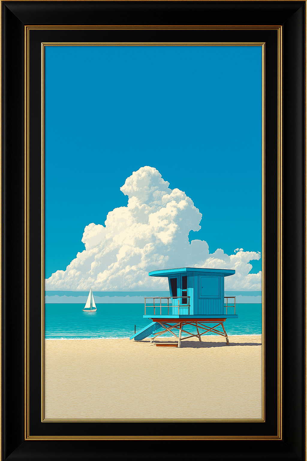 Coastal Calm is a serene and minimalistic artwork that captures the beauty of a perfect seaside day. A lone lifeguard tower, painted in vibrant blue, stands against the warm sand and tranquil turquoise water, while a single white sailboat drifts peacefully in the distance. Towering cumulus clouds rise majestically into the sky, creating a balance between stillness and grandeur. This painting evokes the essence of summer freedom, leisure, and quiet reflection. Perfect for beach houses, coastal décor, or modern interiors, it serves as a soothing visual escape, transporting viewers into the simplicity and peace of a timeless oceanfront moment.