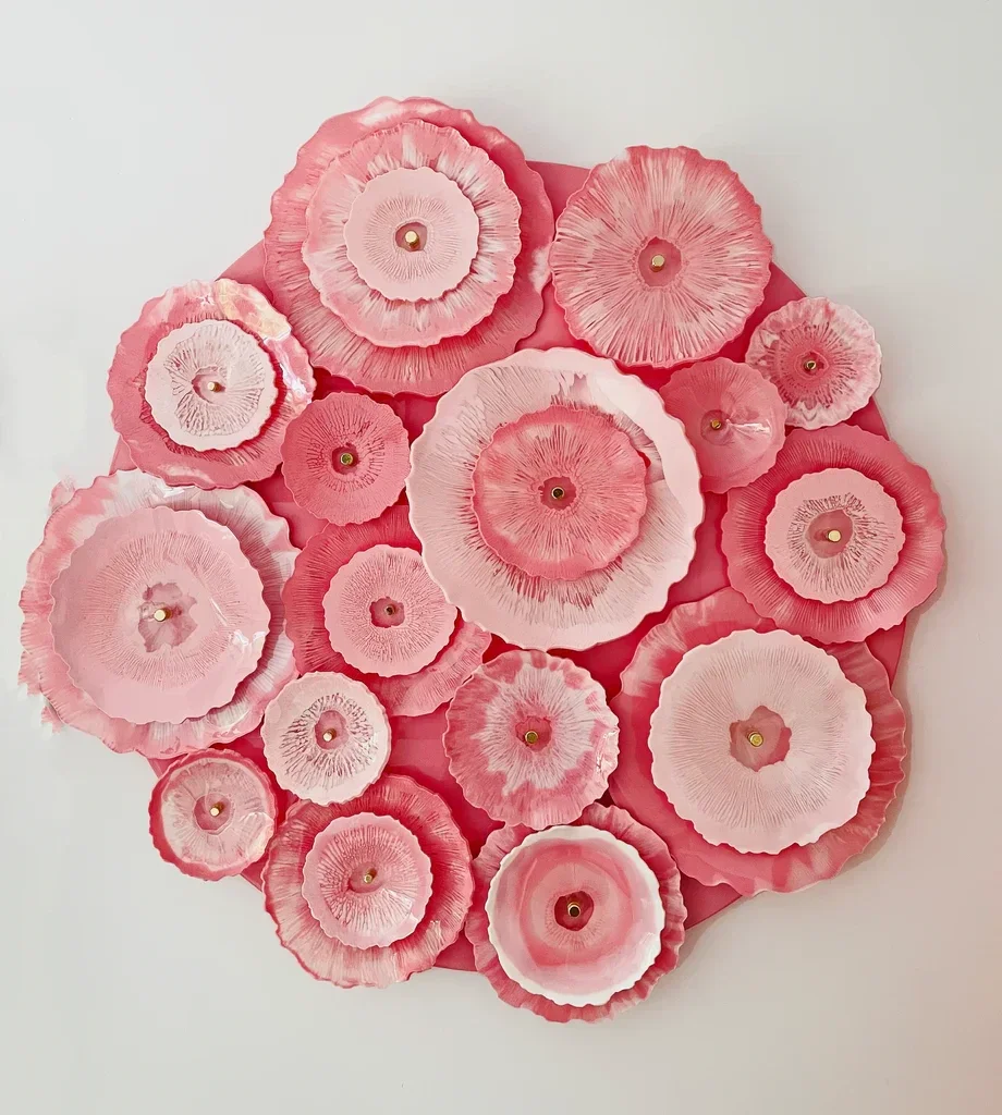 Rose Bloom is a radiant wall sculpture from the Creativity Wall Arts Collection, blending floral charm with sculptural glass artistry. Composed of hand-shaped glass discs in soft blush, rose, and deep pink tones, this circular composition blooms like a living garden captured in glass. Each layered petal-like disc carries fine textural ripples, adding depth and movement, reminiscent of both delicate flower petals and coral formations. The interplay of light across its translucent surfaces creates a glowing effect that transforms any wall into a statement of warmth and vitality. Rose Bloom embodies both elegance and vibrancy, making it a versatile centrepiece for luxury interiors, boutique hotels, galleries, or private collections. Whether displayed as a bold statement in a modern living room or as an accent in a serene sanctuary, this sculptural artwork radiates love, energy, and timeless artistry.