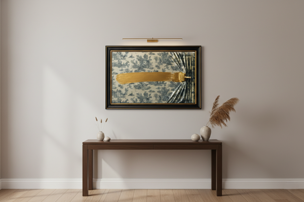 The Golden Passage is a captivating dialogue between elegance and defiance — a bold brushstroke that transforms classic serenity into modern sophistication. The piece juxtaposes a delicate toile background, rich in pastoral scenes and nostalgic calm, with a sweeping band of radiant gold that cuts through time itself. This deliberate clash of tradition and modernity embodies the spirit of renewal, confidence, and fearless creativity.