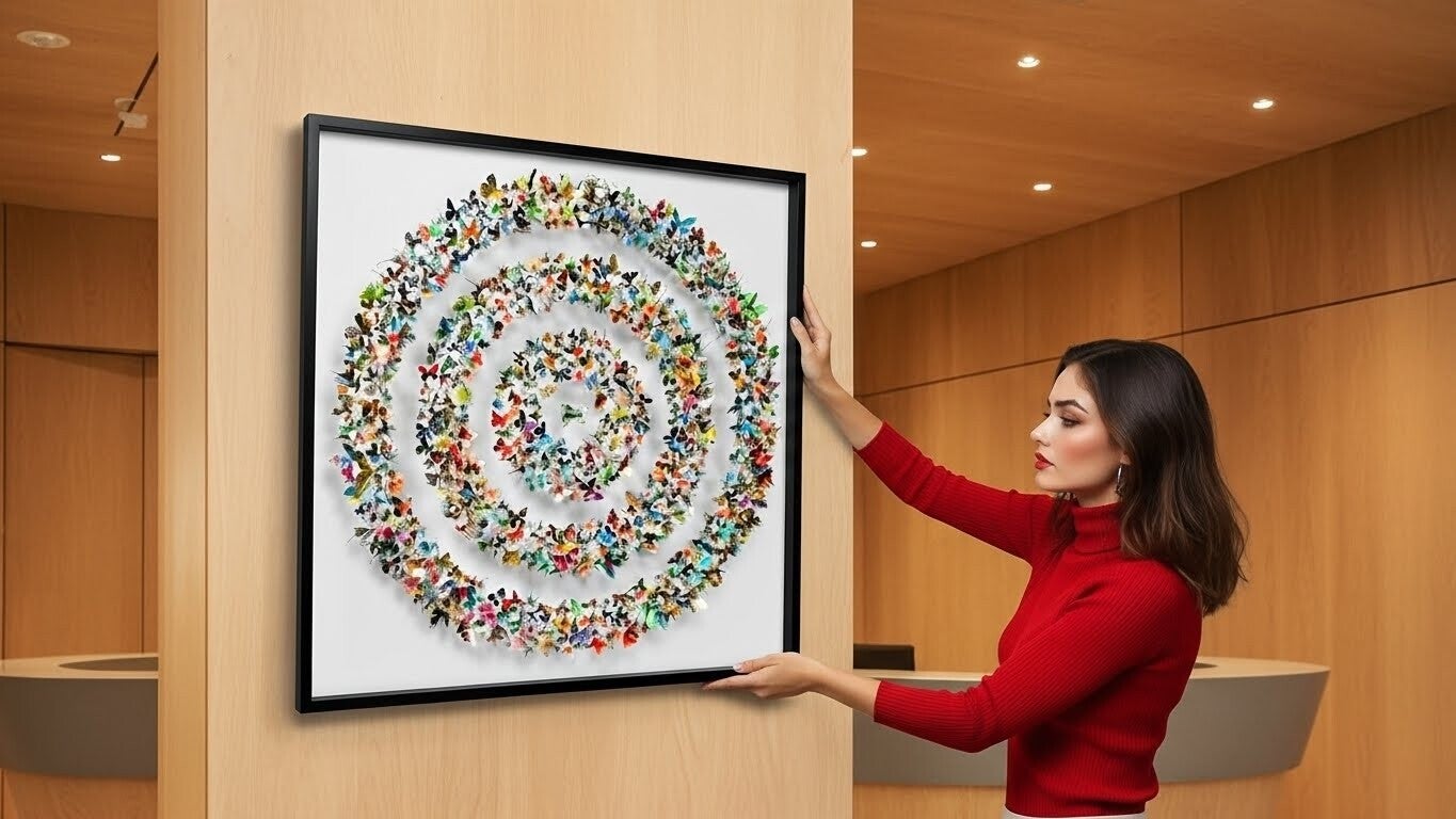 This extraordinary spiral installation features hundreds of individually crafted butterflies arranged in expanding concentric circles, creating a mesmerising sense of motion and depth. Each butterfly is precisely shaped, coloured, and positioned to contribute to a vibrant spectrum that radiates outward from the centre. The piece blends delicate craftsmanship with architectural discipline, transforming a simple wall into a dynamic field of colour, movement, and energy. As light interacts with the layered forms, subtle shadows animate the installation, enhancing its three-dimensional presence. Every artwork is hand-finished, signed by the artist, and accompanied by a Certificate of Authenticity. A striking centrepiece for collectors, luxury interiors, and curated spaces seeking a large-scale, emotionally uplifting statement. "Please note: This art piece requires 35 days for completion and delivery.""Please note: This art piece requires 30 days for completion and delivery."