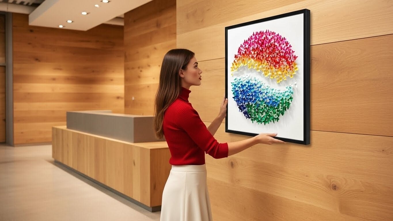 This striking dual-spectrum installation features hundreds of meticulously crafted butterflies arranged in two flowing formations that mirror one another. The upper cluster transitions through vivid reds, pinks, and warm yellows, while the lower section moves into cool blues, aquas, and deep greens. Together, they create a balanced composition reminiscent of natural harmony and elemental contrast. Each butterfly is individually shaped and hand-finished, catching the light with subtle reflective textures that produce delicate shadows and movement. The result is a vibrant, sculptural artwork with a strong presence and emotional depth. Signed by the artist and accompanied by a Certificate of Authenticity, this piece is a commanding centrepiece for luxury interiors, curated spaces, and contemporary art collectors. "Please note: This art piece requires 20 days for completion and delivery."