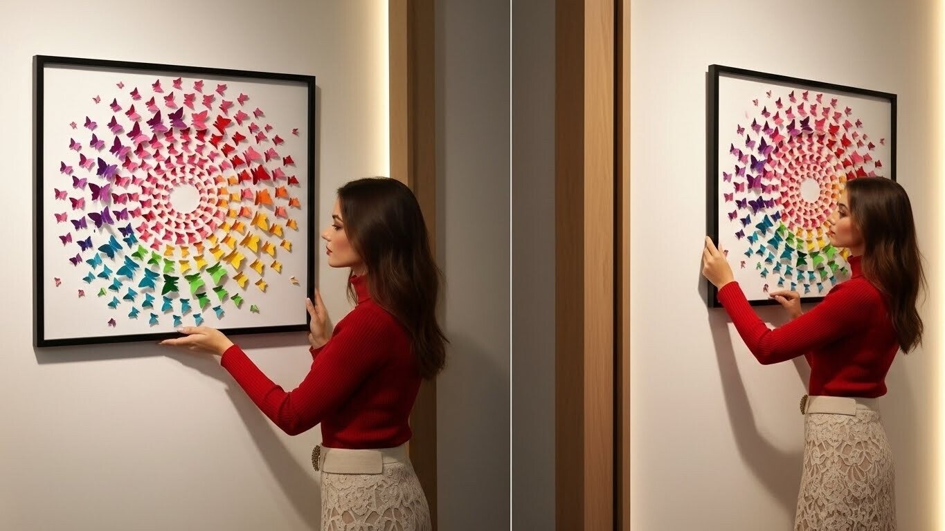 This radiant butterfly installation features hundreds of individually crafted forms arranged in a mesmerising circular gradient. Beginning at the centre with soft pinks and deep violets, the butterflies expand outward into vibrant reds, oranges, yellows, greens, and blues, forming a harmonious spectrum of colour and movement. Each butterfly is hand-shaped and precisely positioned to create a dynamic three-dimensional effect, casting delicate shadows that shift with changing light. The composition evokes themes of renewal, unity, and transformation, making it an uplifting focal point for contemporary interiors. Signed by the artist and accompanied by a Certificate of Authenticity, this artwork offers collectors a sophisticated, emotionally resonant piece of modern sculptural design.- "Please note: This art piece requires 20 days for completion and delivery."