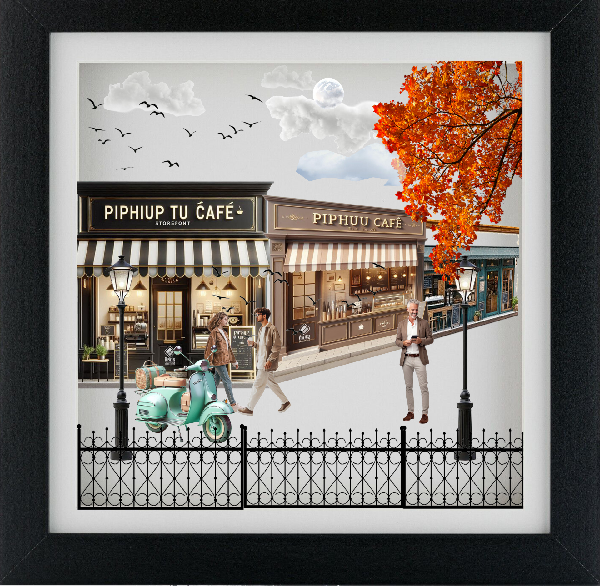 This vibrant mixed-media artwork captures the charm of a European café street scene with exceptional detail and warmth. Crafted from seven high-quality materials—including layered acrylic, premium board, metallic accents, and precision-cut components—the piece brings depth and realism to every element, from the glowing shopfronts to the autumn foliage overhead. The narrative composition, featuring café patrons and a pastel scooter, creates a lively, cinematic moment frozen in time. Professionally framed in a black shadow-box and finished with museum-grade clarity, the artwork arrives signed by the artist and accompanied by a Certificate of Authenticity. A sophisticated addition to modern interiors, boutique hospitality spaces, and curated contemporary art collections.