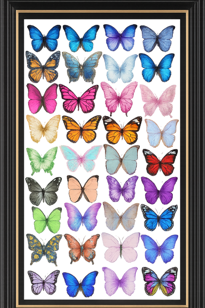 Prismatic Lepidoptera from the Creativity Wall Arts Collection is a captivating celebration of nature’s boundless spectrum. This striking wall art presents a meticulously arranged grid of 30 vividly coloured butterflies, each specimen distinct in hue, pattern, and form. From sapphire blues and royal purples to blazing oranges, neon greens, and delicate pastels, this composition orchestrates a chromatic symphony against a softly radiant gradient backdrop. Encased in an elegant black frame with gold detailing, the work evokes the timeless precision of a Victorian entomology display while embracing a distinctly modern, luminous aesthetic. Each butterfly seems to hover within the frame, its delicate wings suspended in air, symbolising transformation, fragility, and freedom. Ideal for design-conscious interiors, collector galleries, and luxury spaces, Prismatic Lepidoptera brings a vibrant yet refined energy — transforming walls into windows on nature’s most dazzling palette.