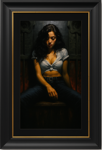 Silent Reckoning” by Anthony Cooper is a limited edition signed artwork that captures the intensity of quiet defiance. A lone woman sits in shadow, her expression caught between resilience and vulnerability. Her posture, strong yet weary, radiates a tension that feels as though it belongs in a film still — cinematic, raw, and unflinching. With deep contrasts, rich tones, and masterful light placement, Cooper transforms stillness into storytelling, leaving the viewer with unanswered questions and lingering intrigue. The tied shirt and rolled sleeves emphasize her strength, while the dim, industrial backdrop suggests a world beyond the frame. This artwork is both a study of solitude and a portrait of inner turmoil. Signed and strictly limited, “Silent Reckoning” is a striking collectible for admirers of noir-inspired fine art and those who appreciate figurative work that goes beyond beauty — into the realm of human narrative.
